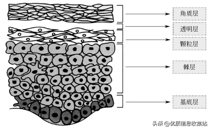 (3)颗粒层由2~4层扁平、纺锤形或棱形的细胞构成。颗粒层(stratumgranulosum)是表皮内层细胞向表层角质层过渡的细胞层,因含有角质透明蛋白会产生脂肪,能抑制体内的水分流失,也可防止外界的水分渗入体内,对储存水分有重要的影响,通常含水量保持在10%~20%。