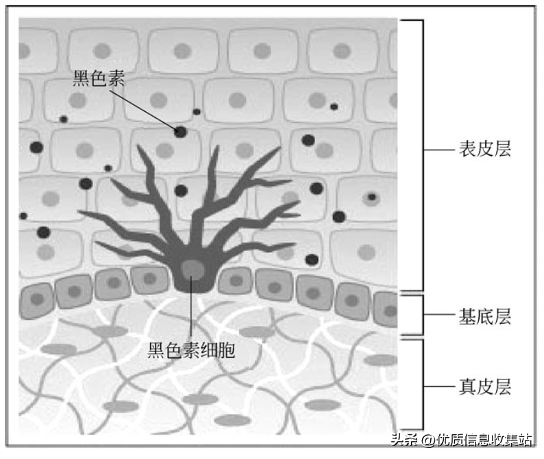 3黑色素的形成与代谢皮肤黑色素的形成过程包括黑色素细胞的迁移、黑色素细胞的分裂成熟、黑色素小体的形成、黑色素颗粒的转运以及黑色素的排泄等一系列复杂的生理生化过程。它的形成可以分为五期,第一期,酪氨酸酶的形成,在黑色素细胞的胞浆内质网中,高尔基体空泡增大,合成酪氨酸酶蛋白质;第二期,前黑色素颗粒期,色素母细胞分泌麦拉宁色素,在外界刺激(如紫外线、自由基)下,麦拉宁色素激活酪氨酸酶的活性,酪氨酸酶与血液中的酪氨酸反应,生成一种叫“多巴”的物质,多巴其实就是黑色素的前身;第三期,黑色素颗粒成熟期,在此过程中,多巴经酪氨酸氧化而成黑色素;第四期,黑色素的转运,成熟的黑色素颗粒堆积在胞浆内,通过细胞的树枝状突起向角质形成细胞转运;第五期,黑色素的释放,黑色素的释放有两条主要途径,一是从肾内排泄,另一途径是经皮肤排出,转移到角质形成细胞的黑色素颗粒随着表皮细胞上行至角质层,并随角质层脱落而排泄。黑色素的一个表皮周期约为28天
