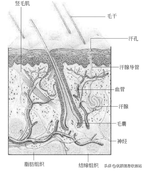 2真皮真皮(dermis)位于表皮之下,与表皮呈波浪状牢固相连,其厚度为表皮的10倍,含有皮肤中60%的水分。真皮层由外向内可分为乳头层和网状层两层,此外还有血管、淋巴管、神经和皮肤附属器、腺体、立毛肌等。