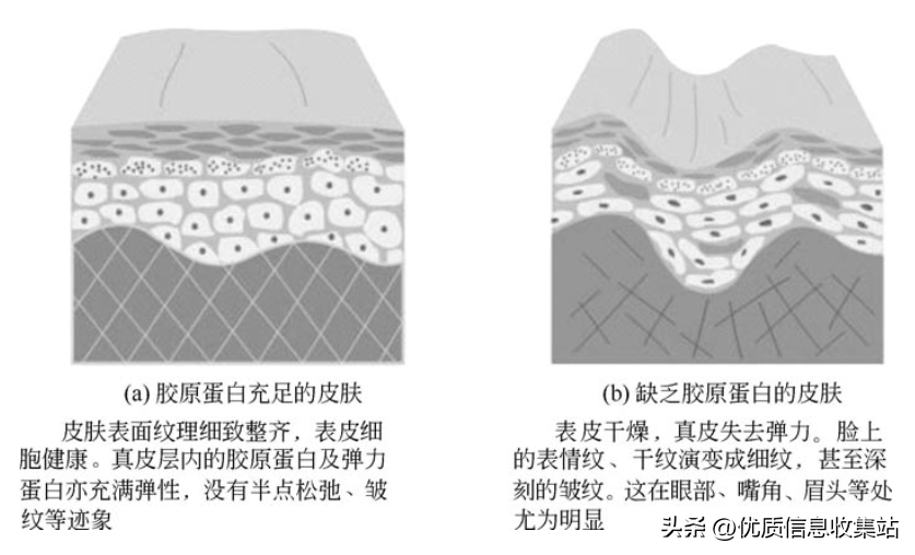 真皮中含水量的下降可影响弹力纤维的弹性,胶原纤维也易于断裂。纤维间基质主要是多种黏多糖和蛋白质复合体,在皮肤中分布广泛,可以结合大量水分,是真皮组织保持水分的重要物质基础。例如透明质酸就是真皮中含量最多的氨基多糖。若真皮基质中透明质酸减少,黏多糖变性,真皮上层的血管伸缩性和血管壁通透性减弱,就会导致真皮内含水量下降,使皮肤出现干燥、无光泽、弹性降低、皱纹增多等皮肤老化现象。所以,在化妆品中常把生物提取的透明质酸作为保湿原料添加到化妆品中。