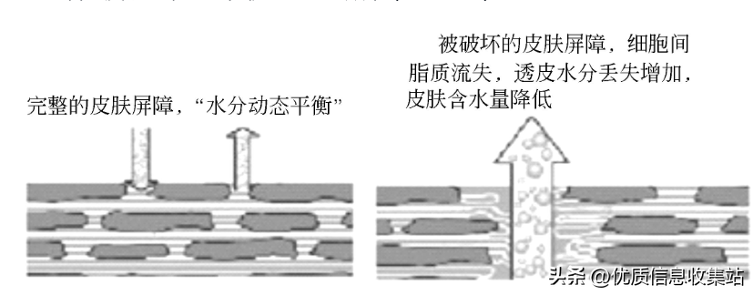 3结合水合作用的水合保湿这类保湿品不是油溶性,也不是水溶性,属于亲水性的,是与水相溶的物质。它会形成一个网状结构,将自由自在的游离水结合在它的网内,使自由水变成结合水而不易蒸发散失,达到保湿效果。它不会从空气或周围环境中吸取水分,也不会阻塞毛孔,亲水而不油腻,使用起来很清爽,这是属于比较高级的保湿成分,适合各类肤质、各种气候,白天、晚上都可以使用的保湿品。这类保湿品的成分以胶原质、弹力素、玻尿酸为代表。