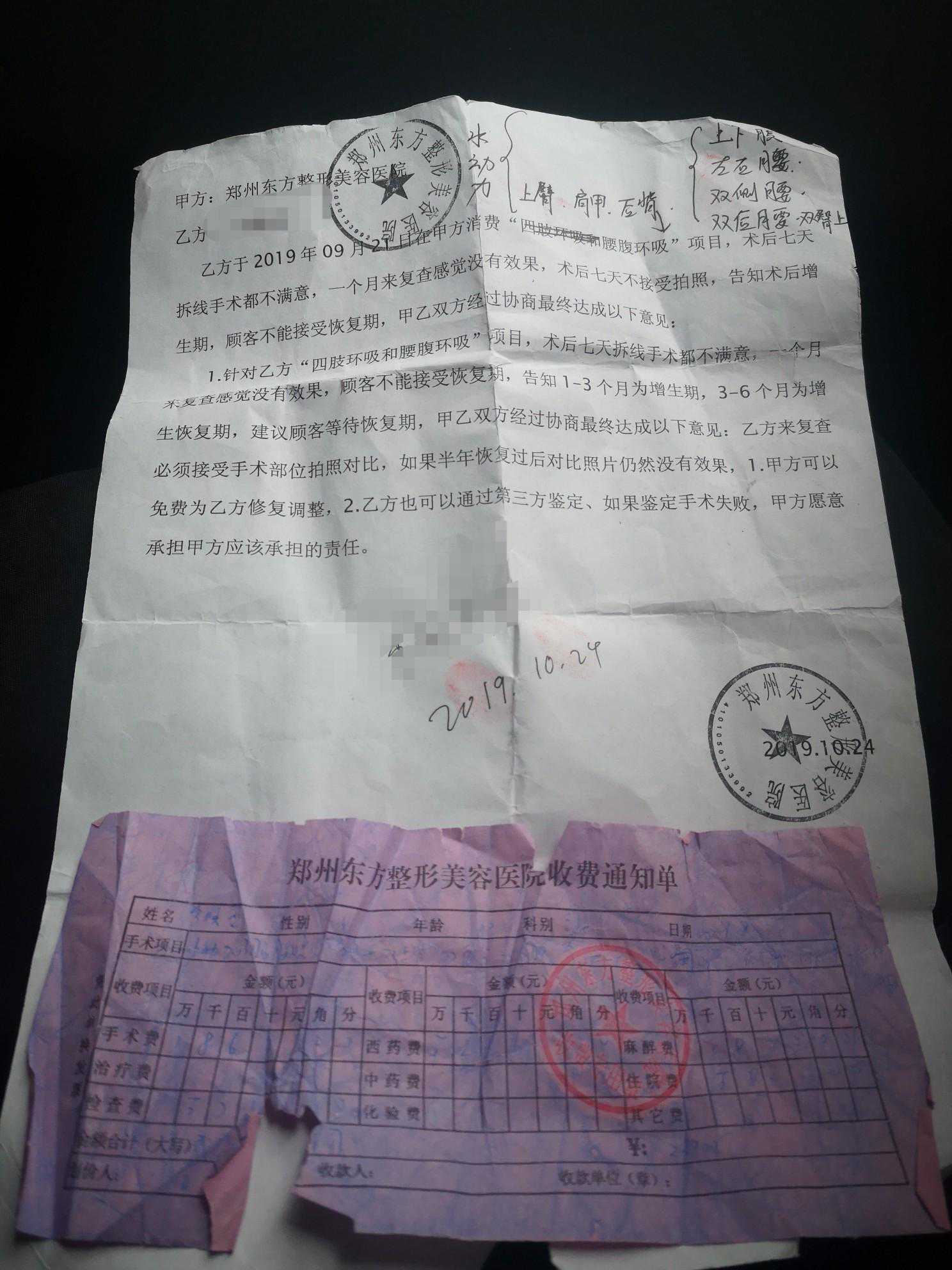 李女士今年35岁,已经是一个孩子的妈妈了。她介绍,为了爱美,去年9月她瞒着家人,在郑州东方整形美容医院做了抽脂项目,花了两万六千元一点效果没有。开始医院承诺的可好了,说是3个月有效果,后来3个月过去了,找他们又说恢复期半年,但又等了半年后还是没有效果,抽完脂后不但没瘦,反而又胖了10多斤。