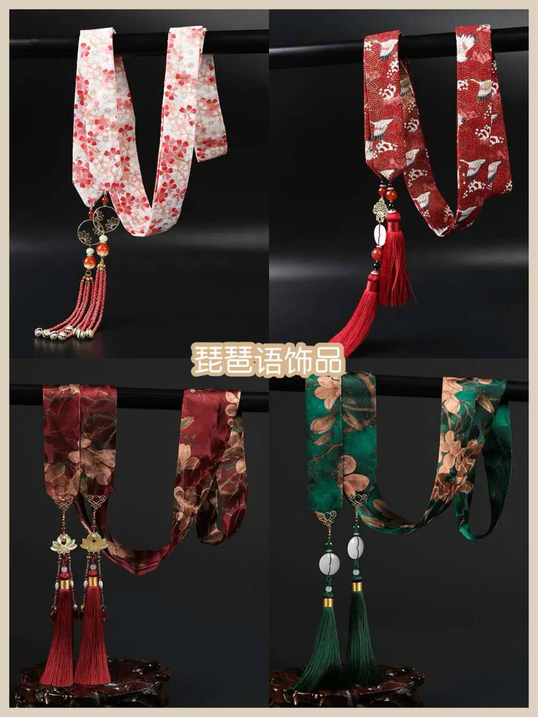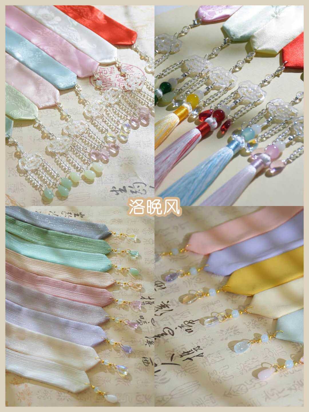 其实说绸缎材质的发带是传统风格也是有失偏颇的,但相对于别的材质来说,它们确实会更适合。在绸缎的基础上做各种暗纹印花的处理,再配上圆润的类珍珠元素做成的流苏,搭配一些青春气质十足的汉服款是可以的。因为相对比常规风格的流苏来说,它们会显得更年轻化一些。