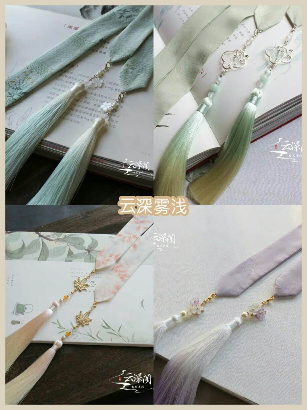 相对于上一组来说,云深雾浅的发带就会更温柔一点,这种温柔不是说气质,而是单纯的从颜色上给到的感觉。不管发带的底色有多浓郁,但始终都是浅色调的格调。加上印花的颜色也非常的清浅,所以能将那种属于汉服独有的韵味给展现出来。配上渐变色系处理的流苏,很是古典优美。