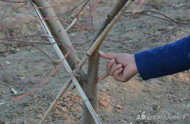 除萌蘖,萌芽后及时抹去嫁接口萌蘖,以集中养分,供上部芽子萌发生长,当枝梢长到30公分~50公分时,苗木开始萌发副梢,这时选留2个东西方向作为主枝,并且两个主枝间距要错开10厘米以上,其余剪除,以便保证主枝的生长优势。剩余的两个主枝培养按照主干形快速整形方式进行。