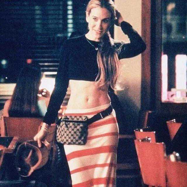 我们对腰包的印象或许还停留在公交车售票员的专用包包,但是在同时期的欧美国家,早就有腰包以时髦的姿态出现在日常穿搭中了。像在2001年《欲望都市》中CarrieBradshaw就曾经以一件croptop上衣搭配低腰条纹裙的经典造型出场,让人印象深刻的还有腰上挎的那只Gucci腰包。在她身上,你找不到半点土气的感觉吧。而且还觉得莫名的和谐,这是为什么呢?这可能要从腰包的属性开始说起。
