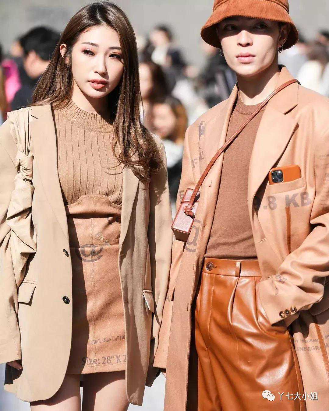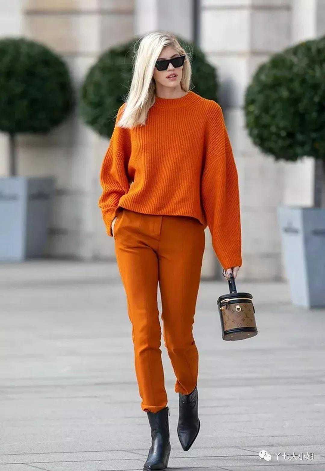 南瓜色同色系整套穿搭总是能穿出强大气场,而深浅不一,或者面料不一的同色系搭配,也是穿出“高级感”的一种技巧。