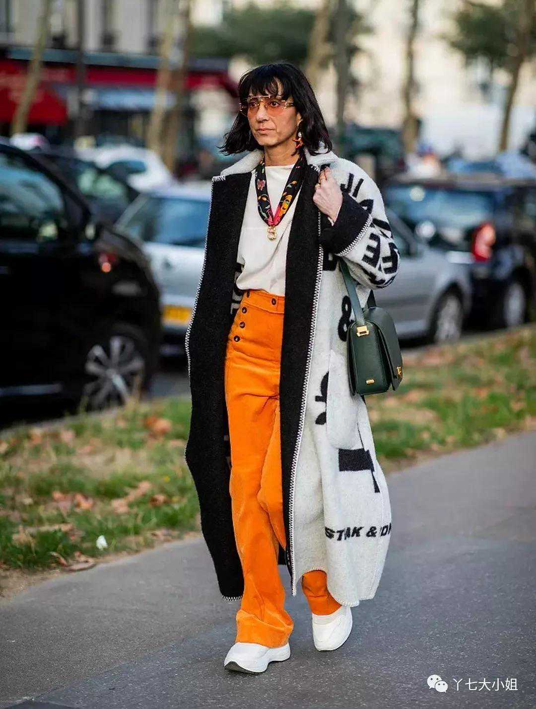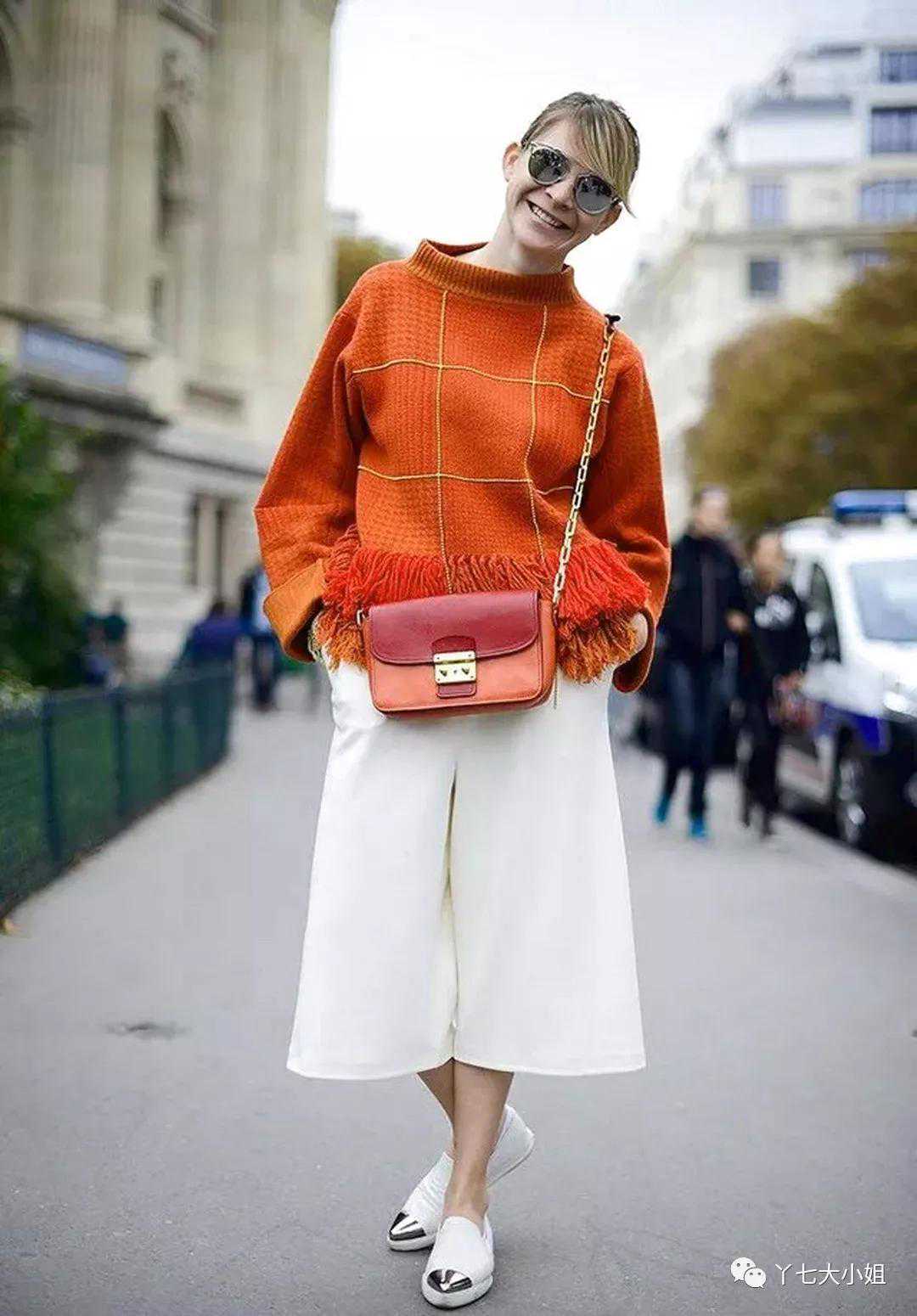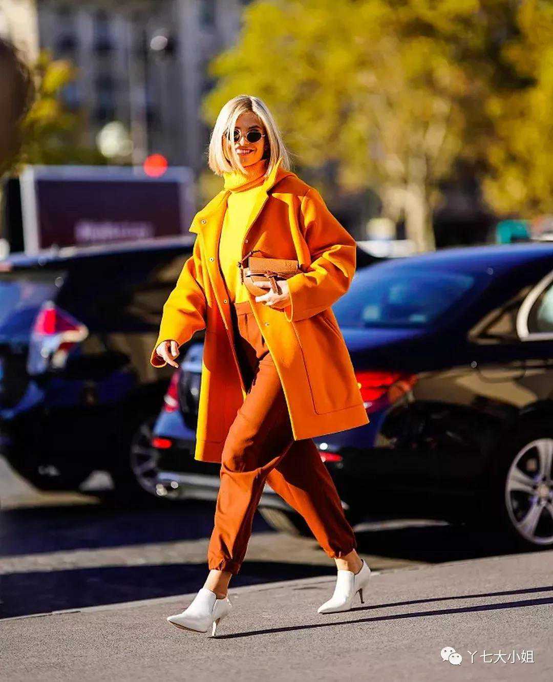 南瓜色在街拍中的表现,也是非常出色的,用在皮衣、大衣、毛衣、裤子、裙子、鞋帽包包上都非常精彩。▼