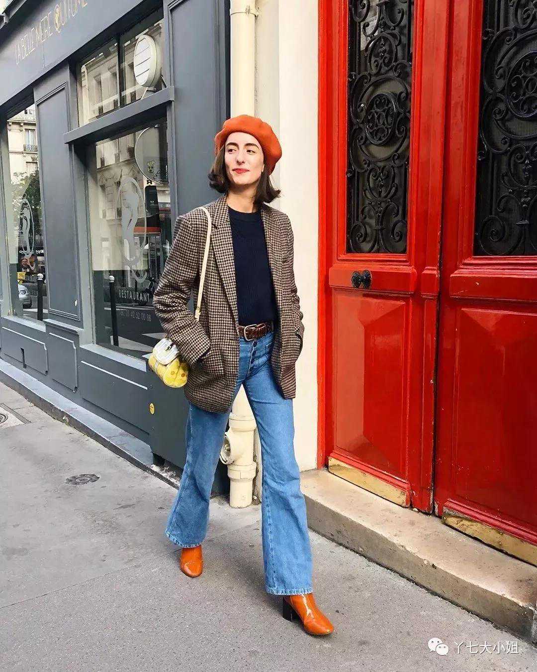 作为皮靴,搭配常见的蓝色牛仔裤,黑白灰以及大地色的裤子,都比较百搭,即使一点点面积的色彩,也可以点亮全身的风采。南瓜色皮包亦然。▼