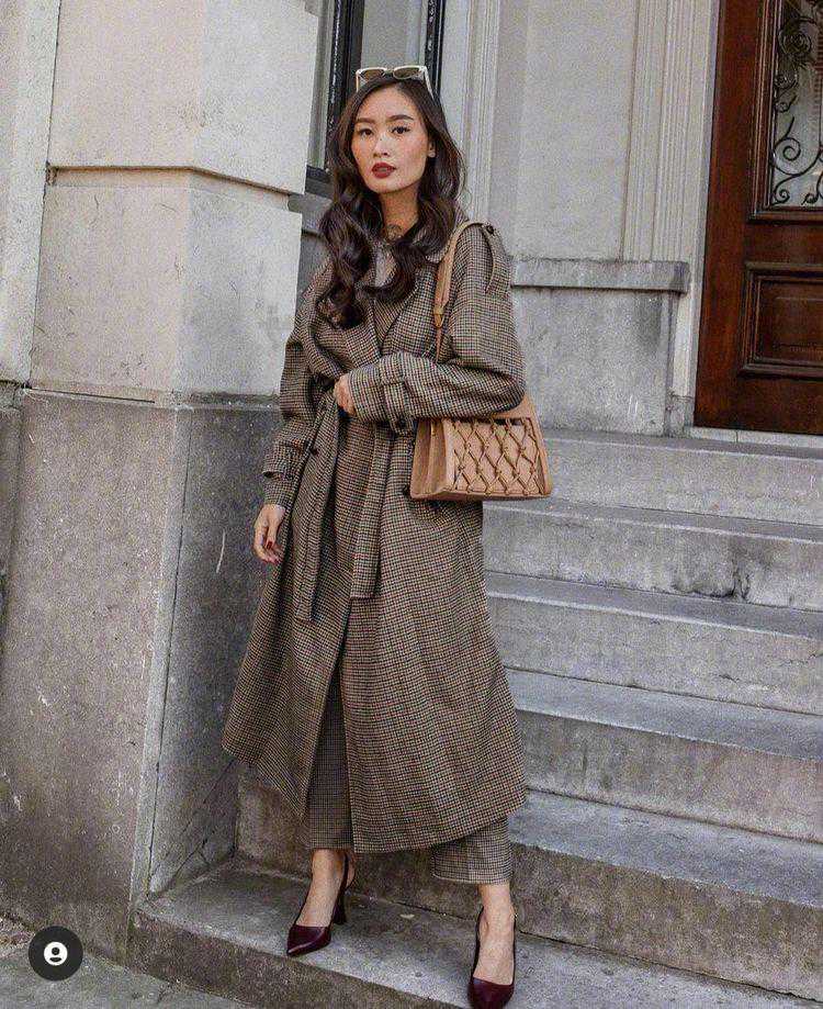 棕色系的外套也是秋冬季搭配里必不可少的,这个小姐姐换的一身复古版型的外套,oversized的款式,穿上很有娃娃款,内衬一深黑,神秘又深邃,这样一身造型穿上很有贵妇气息,一个黑色的皮质简约款包包,更是让造型成熟了不少。