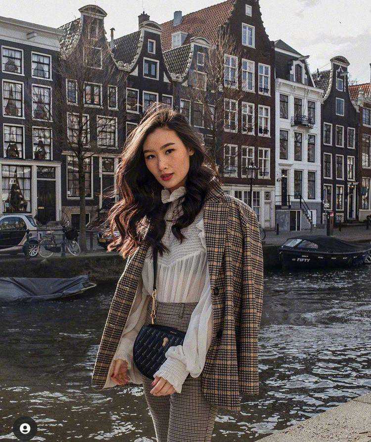 小编觉得,她非常善于将各种不一样的风格的单品完美的结合在一起,比如一件白色网纱的荷叶边上衣,外面套上一身干净利落的棕色格子西装,这样一身造型复古又不失仙气,甜美里又显得端庄,小编觉得也适合职场搭配。