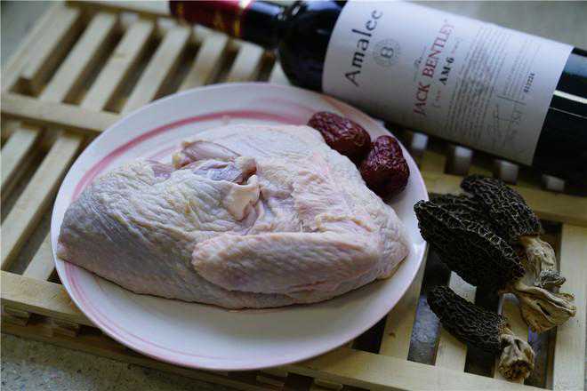 1.如图备料:处理好的鸡半片,羊肚菌4个,红枣2粒,红洒半瓶。