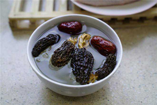 2.提前将羊肚菌及红枣用清水泡洗干净,红枣捏碎了备用。
