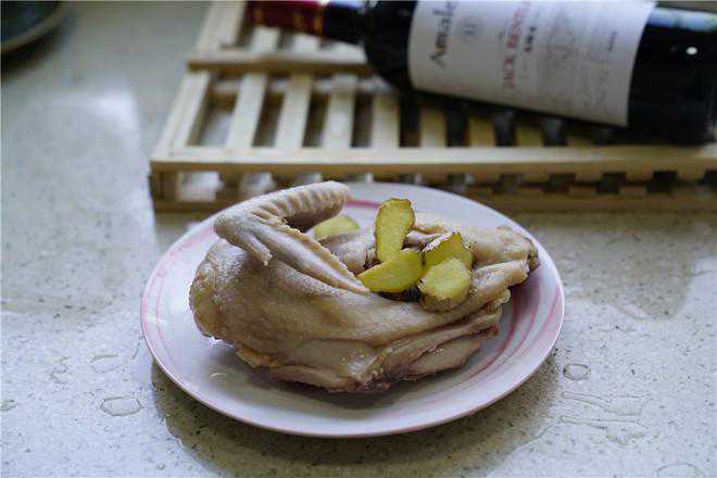 4.将这半片鸡焯洗好,然后姜去皮切片备用。