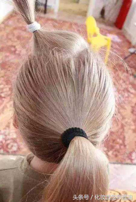 扎好的小辫子,调整之后,发尾继续绷上一个小皮筋,从扎发的中间分开。