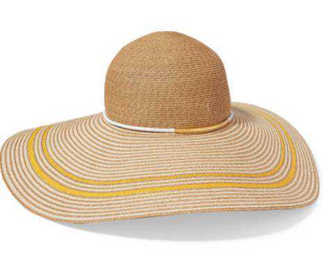 EugeniaKim这款驼色的日式纸草帽织有乳白色和黄色的条纹图案,边饰上缀有别致的金色装饰条。无论于都市漫步,还是假期旅行,它都能为面部和肩部的娇嫩肌肤提供良好遮盖,防止晒伤。