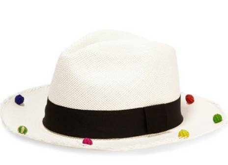 帽子边缘装点着趣味十足的多彩圆球,并束有一根黑色罗缎带,潇洒之余更不失俏皮。