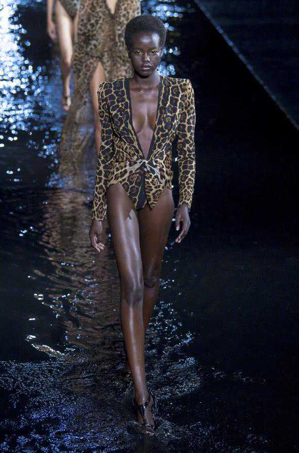 SaintLaurent此次的衣服看上去像内衣的感受,还超等性感呢,的确即是秒杀维密的节拍啊,并且这些模特都把衣服的滋味展示出来了,这位模特身上穿戴的也是豹纹,和黑皮肤造成比拟,加倍性感了!