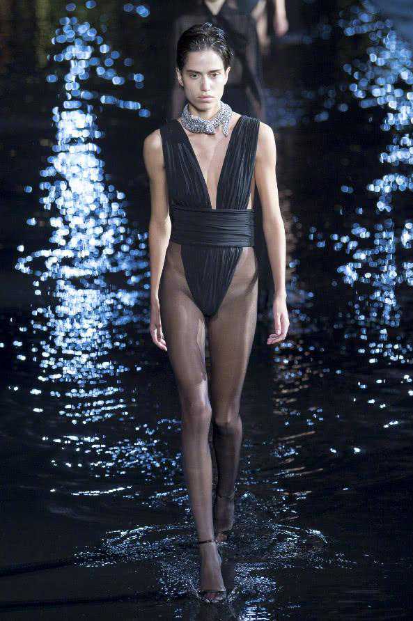 SaintLaurent要紧以少许玄色为主,这位模特身上穿戴的即是玄色的比基尼,有点褶皱的绑带计划,看上去超等美,搭配一双玄色高跟鞋,拉长了腿型,看上去模特身段的确太好了!