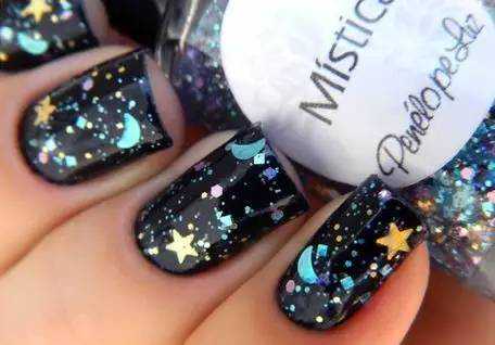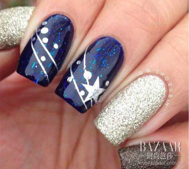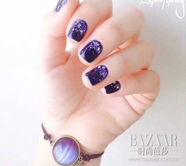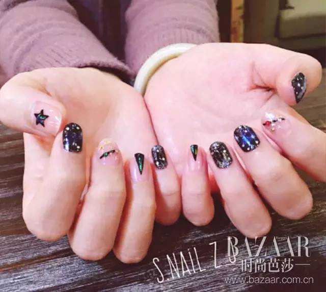 相信有很多宝贝们要问了,何为星空甲?就是在指尖以深色为底,然后用浅色点缀在上面,营造出反差萌的星空即视感。