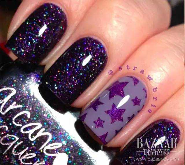还有一种穿插范儿的!星空的样式不涂满所有指甲而是选涂,搭配金属色系来回交叉尽显高端!