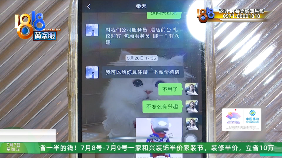 微信对话显示,当时“秦天”告诉李女士,招聘的是酒店前台、礼仪迎宾和包厢服务员,李女士回复说“不怎么有兴趣”,还问对方:“不会是KTV吧?”