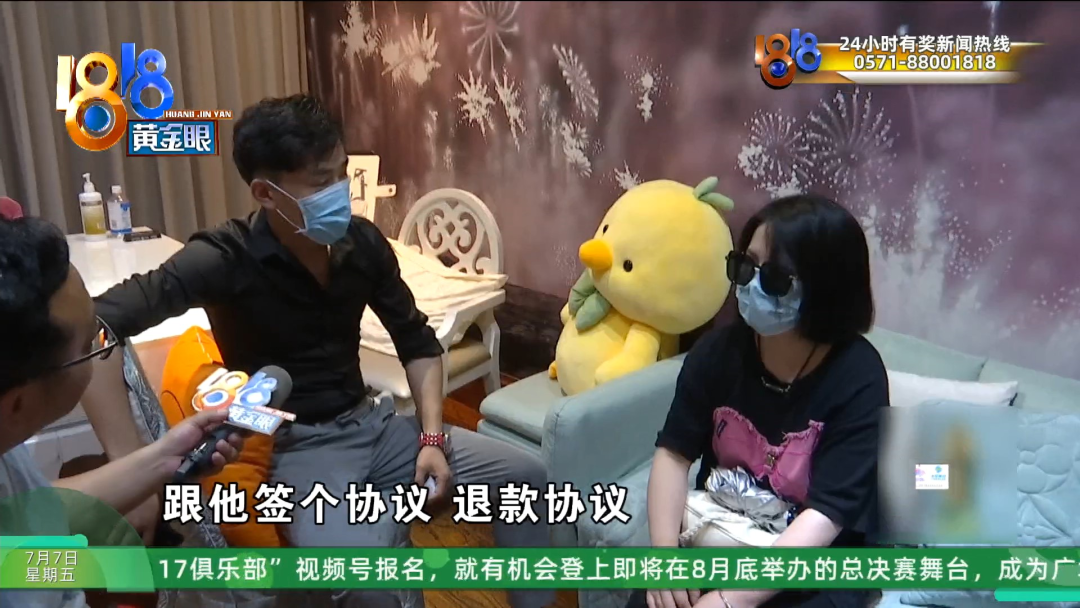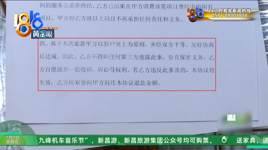 申总拿来了一份退款协议书,记者注意到,甲方是丽都和美,乙方和退款金额等都是空白。其中有这么一条,大概内容是本次退款达成后,乙方也就是两位女士不得向第三方透露此事,负有保密义务,乙方自愿放弃一切投诉、诉讼等权利。如果违反,乙方双倍返还退款金额。看到这样的条款,两位女士犹豫了。