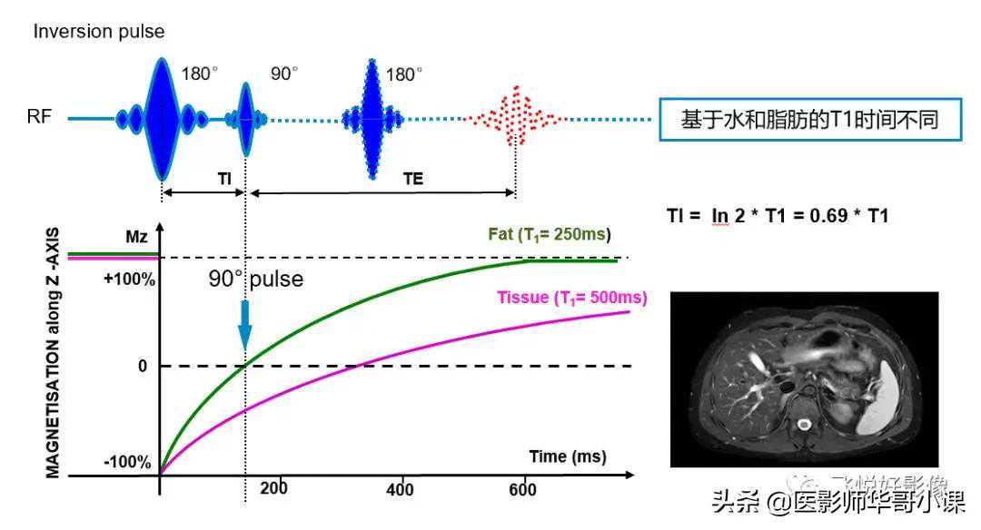 STIR是基于水和脂肪的TI时间不同来进行脂肪抑制的短TI恢复翻转序列。首先给予180°非选择性翻转脉冲,脂肪、水及其他组织的信号都将翻转到负向纵轴最大值(上图绿线代表脂肪的信号,红线代表水的信号),随后脂肪、水的信号都将从负向纵向磁化强度矢量逐渐恢复,当脂肪信号经过0点时,施加90°射频脉冲,这时水的信号虽然在负向磁化矢量,但仍然存在信号,因此水中的氢质子受到射频激发,脂肪中的氢质子未被激发。