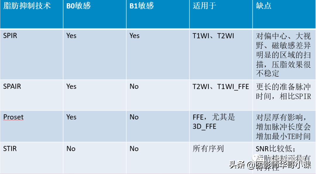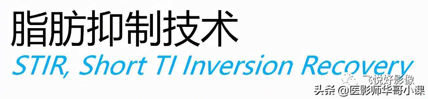 上述四种脂肪抑制技术中只有STIR对B1、B0场变化不敏感,因此其适合大范围压脂,脂肪抑制效果好,但其脂肪抑制不具有特异性,可能对血肿、增强后的病灶等进行抑制。