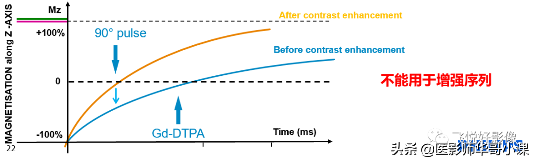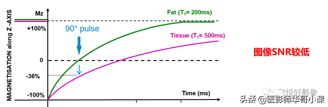 由于90°激发脉冲施加的时候,水和其他组织的信号大约恢复到负向纵轴的-36%,未恢复到其最大信号,直接导致了图像SNR下降。