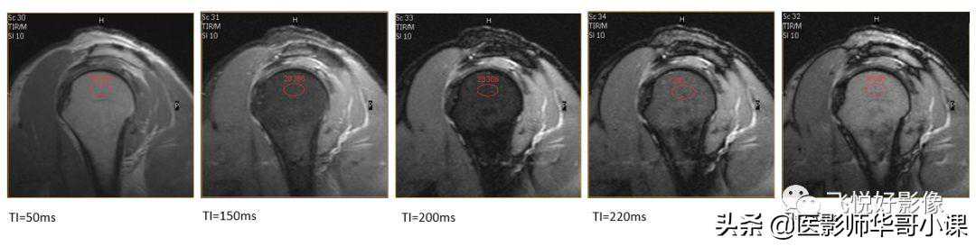 参数方面,STIR的脂肪抑制效果与TI值的设定密切相关。一组图中,除了TI所有参数都一样,TI依次增加,我们发现,第2和第3幅图脂肪抑制效果较好。