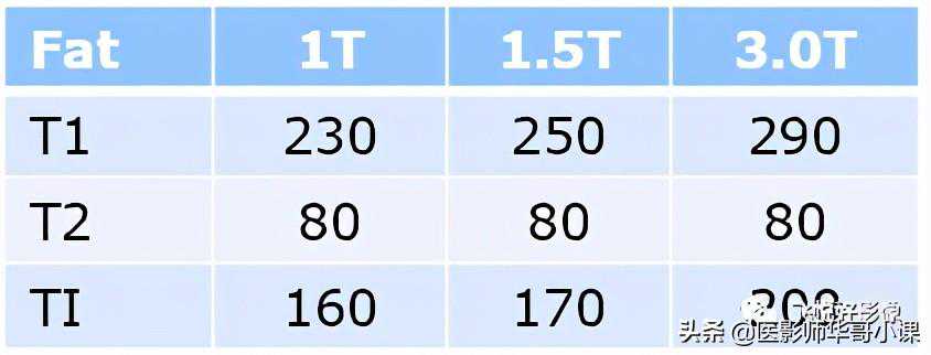根据磁场强度不同,T1值也有所不同,TI=155ms(1.0T),TI=165-180ms(1.5T),TI=200-220ms(3.0T)。