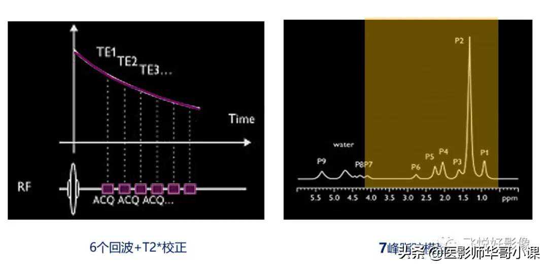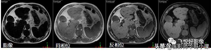 当在同相位时间,也就是水、脂相位一致的时候采集信号,这个时候信号等于水、脂信号之和;当在反相位时间,也就是水、脂相位刚好差距180°时采集信号,这个时候信号等于水、脂相减的绝对值。