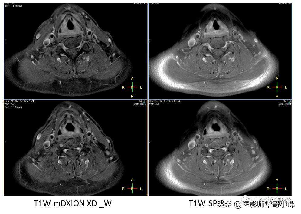 在颈部扫描中,脂肪抑制一直是难点,上图中右侧一组图像是T1W_SPIR,看到脂肪抑制不均匀,仍残留部分脂肪信号。左侧一组图像是mDIXON_XDTSE,脂肪抑制均匀,更好的显示组织对比。