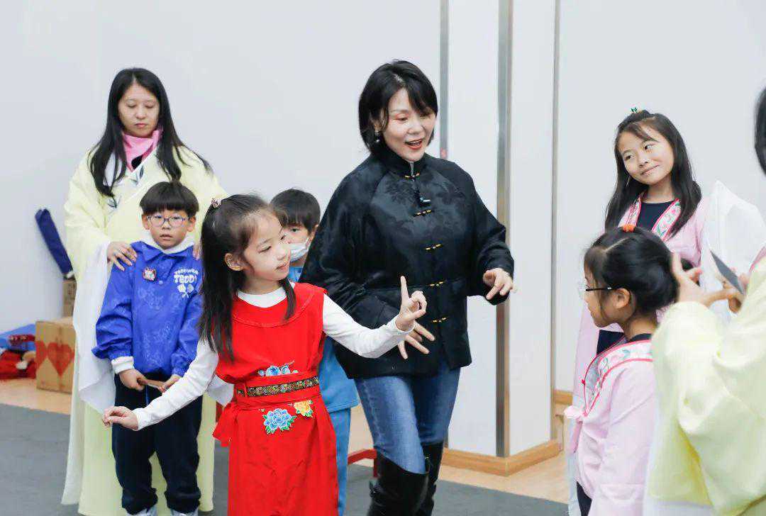 活动室内,沈倩带领大家一起阅读越剧绘本《天上掉下个林妹妹》,在经典折子戏的故事中,巧妙融入越剧装扮、唱腔等几大特色的讲解。家长和小朋友分别穿上水袖学习花旦和小生的站姿、动作,跟着学唱“天上掉下个林妹妹,似一朵轻云刚出岫”。当天一位小戏迷特地穿上了贾宝玉的服装来参与活动,向沈倩请教了关于越剧小生表演的技巧。对于孩子们而言,《红楼梦》的故事或许还有点深奥,但是通过绘本、经典选段的学唱,触发了孩子们对越剧、中国传统戏曲文化的兴趣。