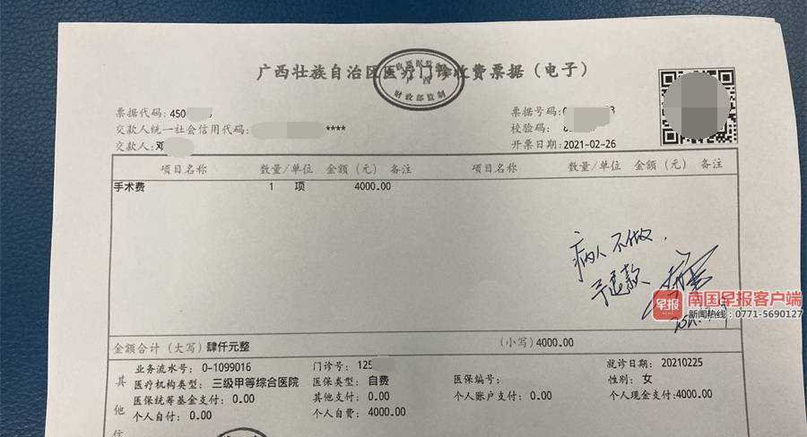 3月9日上午,邓女士带着发票找到医生黎宁,黎在发票上签了“病人不做,予退款”的字样,对此,邓女士十分不满,“不是我不做,而是医生自己漏掉了。”