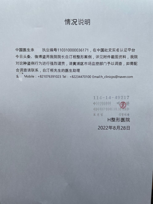 那一天,王女士联系自己在韩国的同事,希望可以找到靠谱的医美机构修复做毁的颧骨,在同事推荐的医院中,王女士惊讶地发现余西在微博分享的案例图片,竟多数搬运自韩国H医院院长白汀桓个人YouTube的主页,如此戏剧化的发现让王女士一边留存下了大量盗例的证据,一边迅速找到余西想讨个说法。