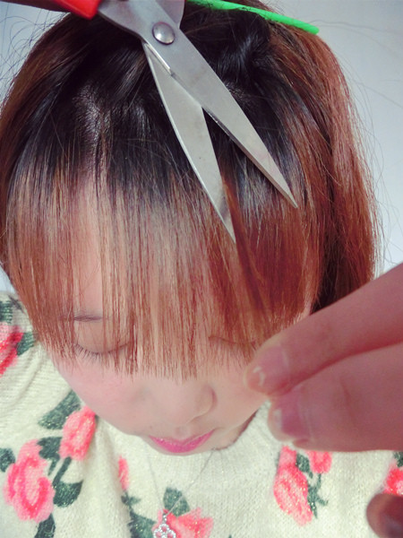 依然把头发分成两层,因为我们已经剪好刘海了,所以发尾我们就不需要在修剪了,我们只需要把多余的刘海剪掉就可以了,手法依然是斜着从上到下,慢慢的拉剪,剪刀自己觉得适合即可