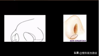 鼻翼还涉及到一个关键的部位就是鼻孔,要是鼻孔的大小正常,可以采用向内收窄的切口,减少对鼻孔大小的影响,比如右边的图,要是鼻孔过大呢,可以采用向内打开的切口,缝合后来缩小鼻孔。