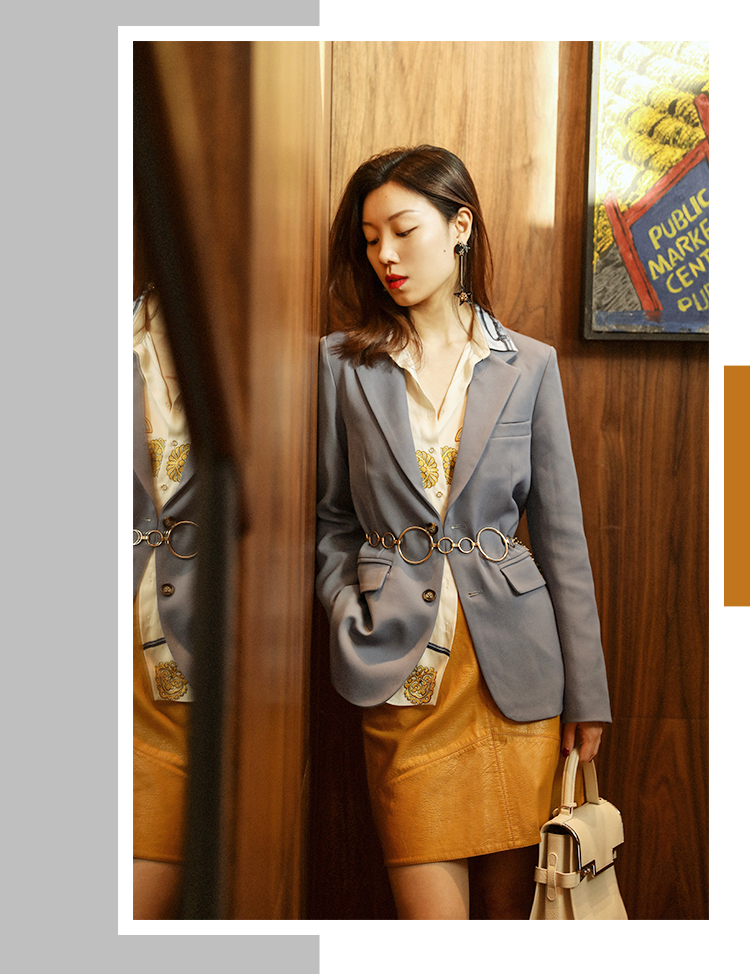 最后要跟大家推荐的,是这款圆环腰链。很多妹子们一看到这类腰链,就会觉得它风格比较固定,仅限于街头风。但实际上,它能驾驭的风格可不止一种。除了走街头风,我之前在职场装中也拿它来搭配过。