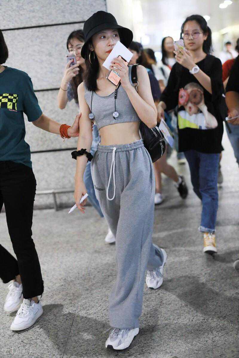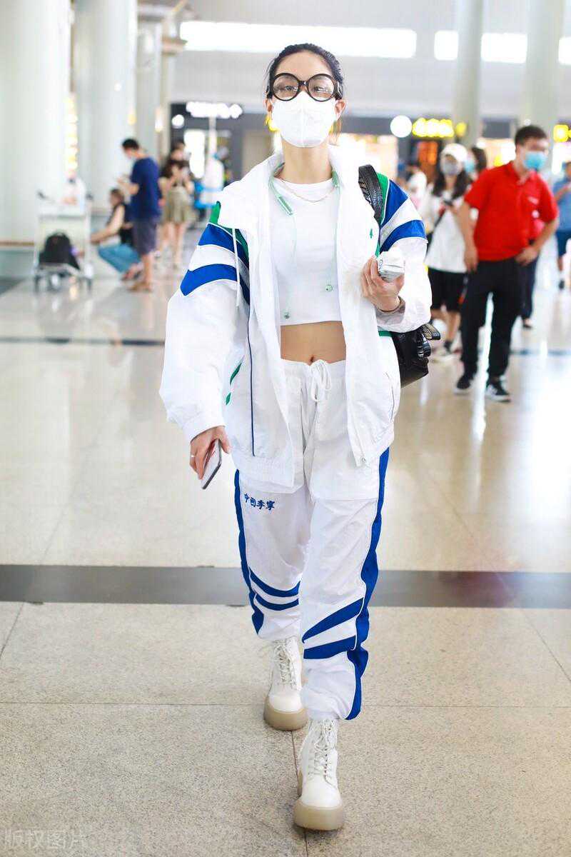 奚梦瑶,白色侧条纹运动套装+黑色印花抹胸背心休闲潮范。