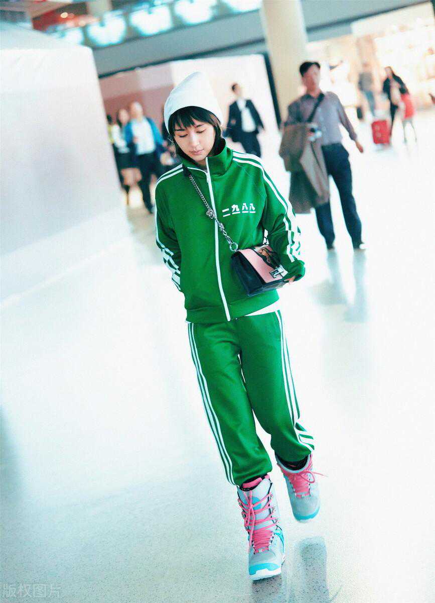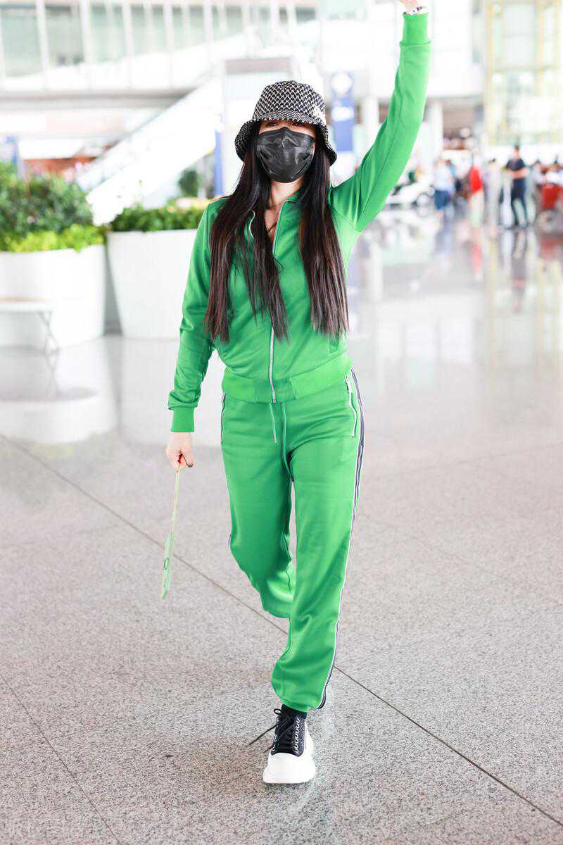 钟丽缇,绿色运动外套+运动裤+厚底运动鞋+渔夫帽运动休闲。