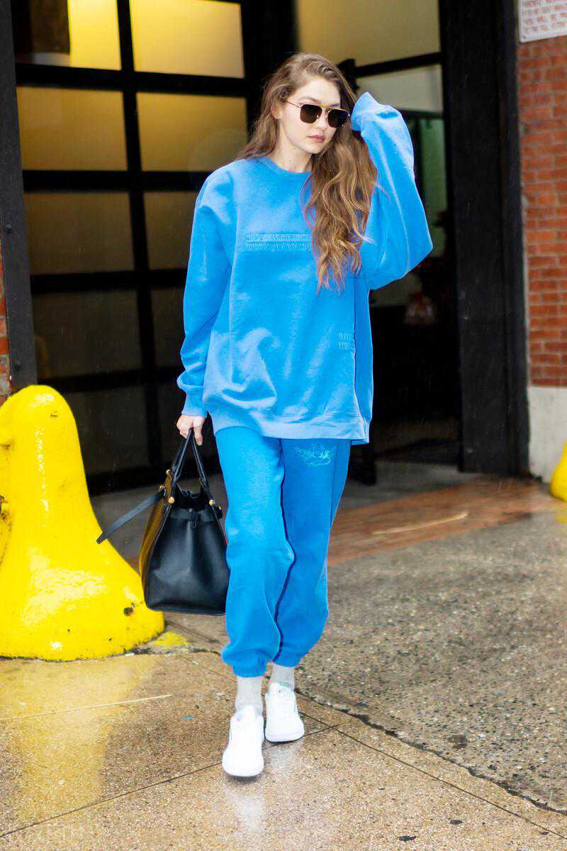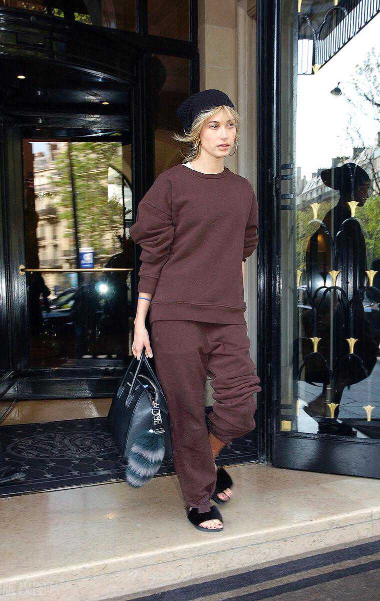 海莉-鲍德温酒红色运动套装休闲随意风,黑色毛毛拖鞋时髦帅气。