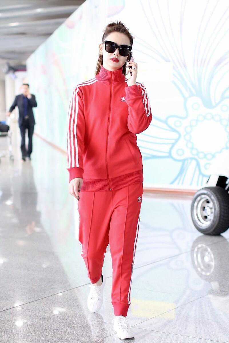戚薇面架GentleMonster墨镜,高马尾搭配Adidas三叶草红色运动装非常有活力,脚上的小白鞋也承接了运动服上的白色条纹。