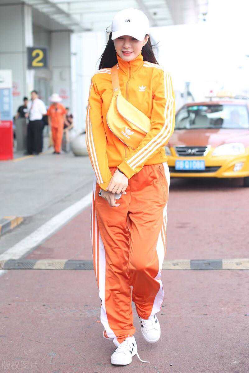 沈梦辰,Adidas橙色运动套装时髦休闲棒球帽+挎包潮爆有型。