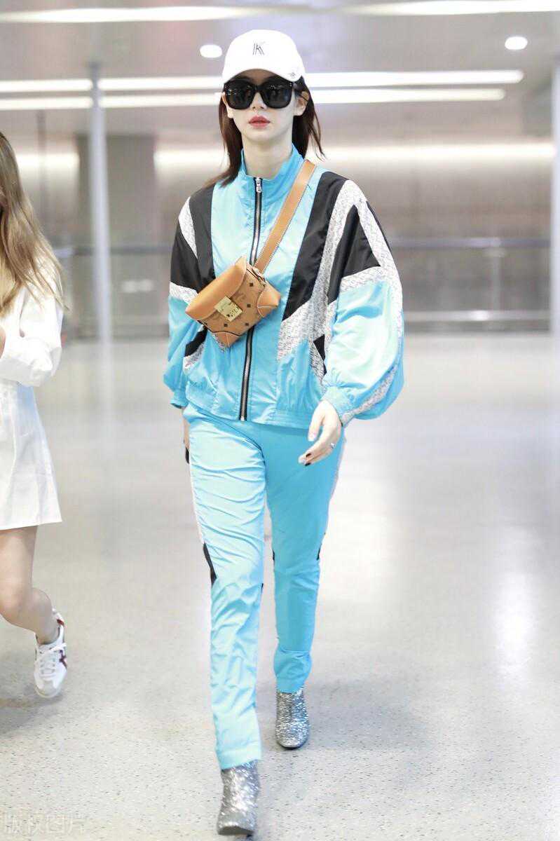 戚薇,蓝黑色拼接运动套装+棕色挎包银色高跟短靴个性张扬。
