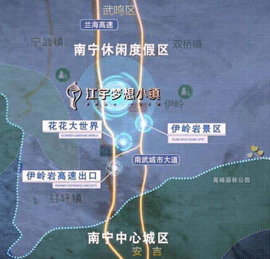 江宇梦想小镇所属伊岭片区聚集了多种的旅游资源,拥有着混然天成的山峦、丘陵、林海等奇观。依托天然的山谷地理优势,江宇梦想小镇打造了集吃喝玩乐购为一体的4000亩文旅“世内桃源”,集骆越文化体验、婚庆一站式服务、山水体验旅游、度假养生旅游、都市田园休闲旅游为一体。