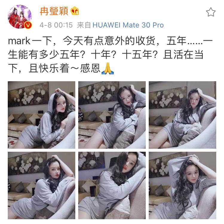 4月8日凌晨,冉莹颖深夜发美照,穿的还是白天那身灰色的运动套装,并且很感恩现在的生活,看来她很满意现在的生活。