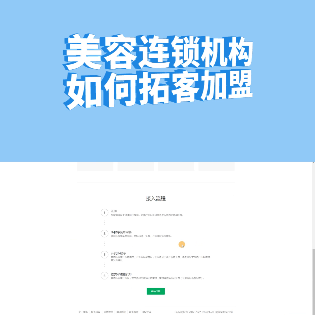 →第一步是在微信公众平台上注册小程序账号。如果已经有服务号,可以直接在后台选择小程序管理,快速注册和认证小程序功能。