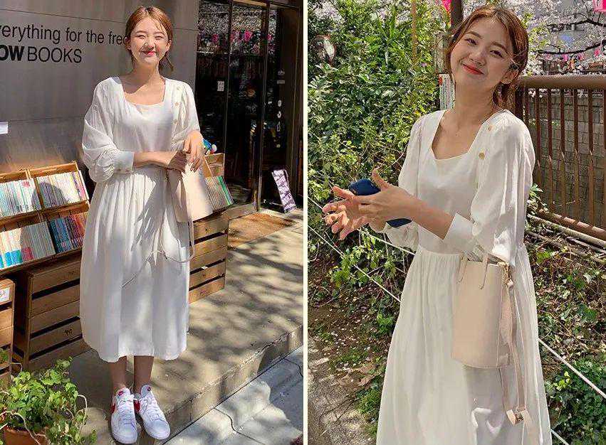 因为裙子是甜系的单品,而运动鞋非常的休闲,两者搭配在一起,甜而不腻,还多了一丝青春活力感,让整体看起来更加灵动,手拿一款米色系包包,显得格外温柔气质。